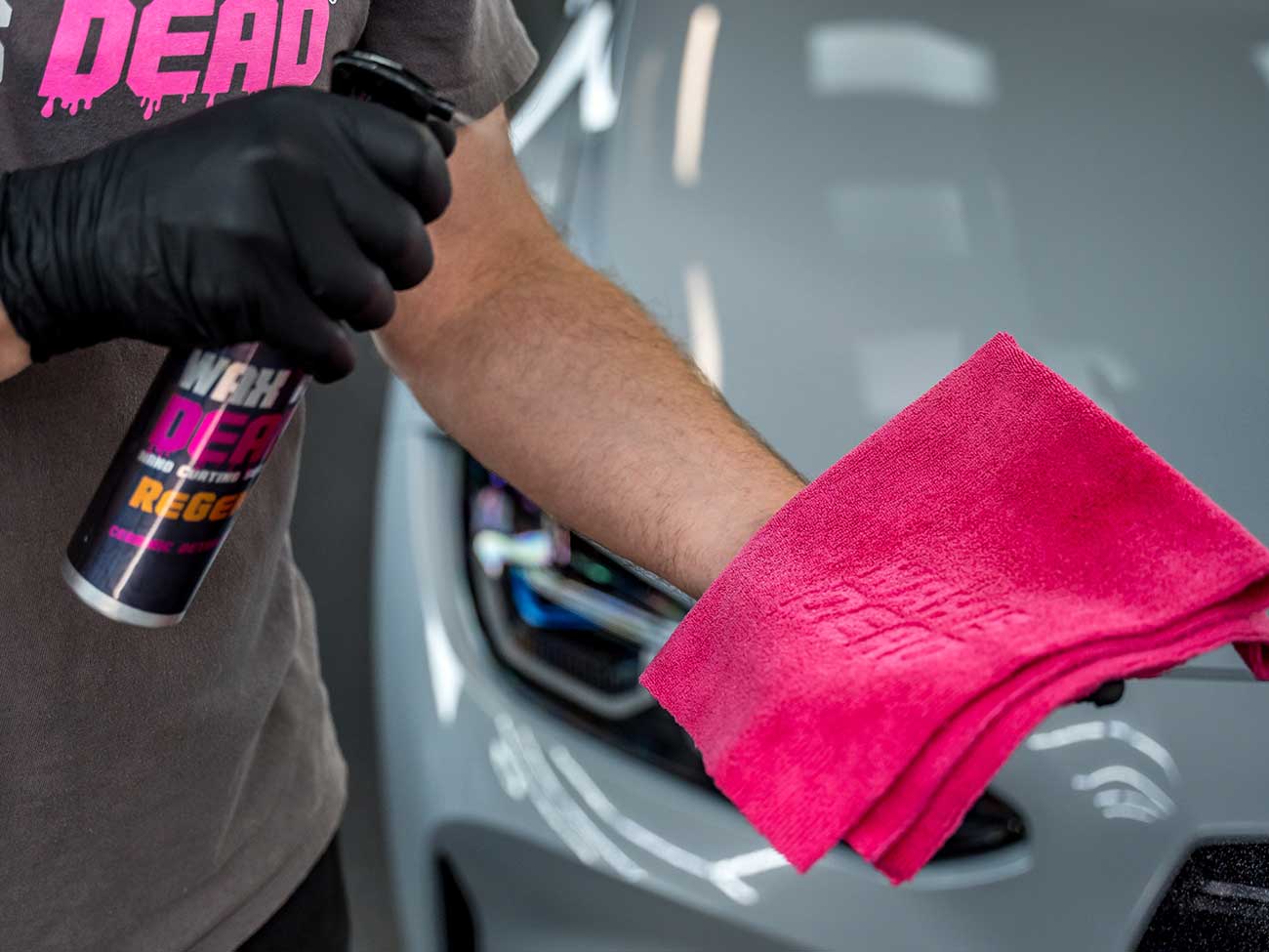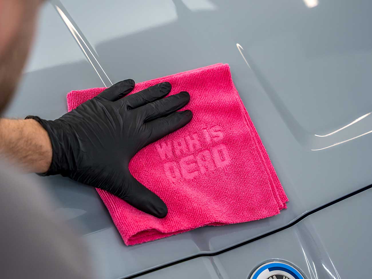 The revolutionary edgeless microfiber towel by Wax is Dead offers unmatched efficiency, preventing scratches and streaks while effortlessly delivering a flawless, lint-free finish.